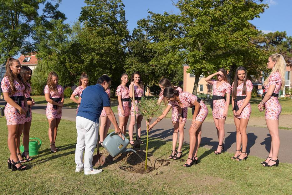 Oravecz Nóra, Orosháza alpolgármester asszonya, Fásy Ádám , a verseny ötletgazdája és a döntős hölgyek a felkészítő tábornak helyet adó város közkedvelt fürdőjében ültettek el egy Japán fűzt a tóparton.